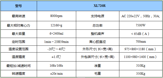 单管容量:1000ml 总离心容量:6×1000ml Max.Speed:7200rpm Max.Rcf: 12166 × g | #2角转子 |